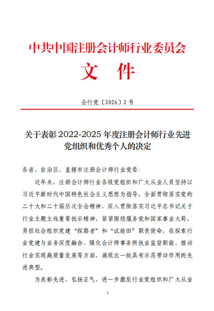近日,中国注册会计师行业党委正式印发《关于表彰2022-2025年度注册会计师行业先进党组织和优秀个人的决定》,对过去四年间在注册会计师行业党建工作中表现突出的先进典型予以隆重表彰。其中,浙经天策会计师事务所董事长褚梅云凭借对行业党建工作的坚定支持、务实举措和显著成效,光荣当选“支持党建工作(党外)合伙人”,成为全国注册会计师行业党外人士支持党建工作的标杆典范。