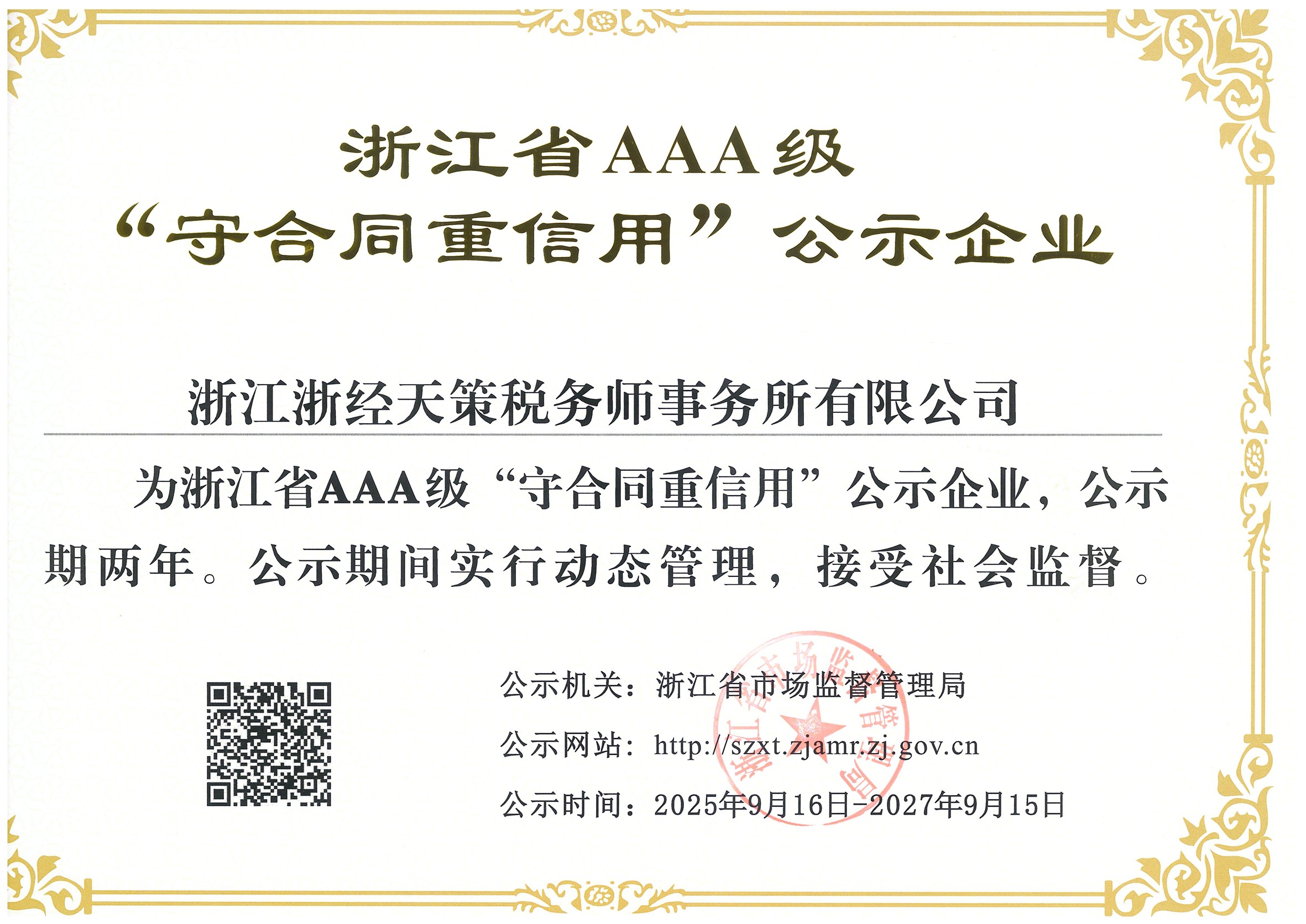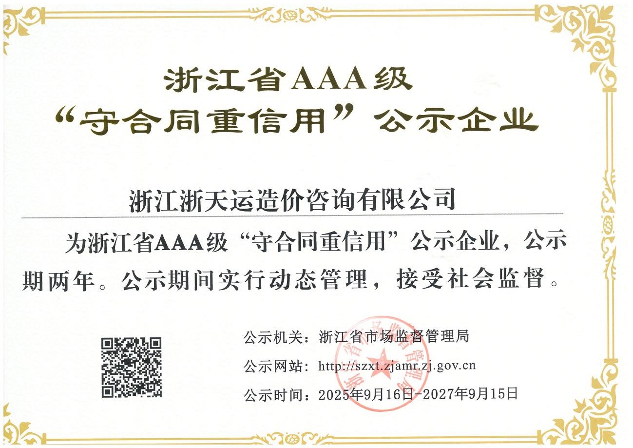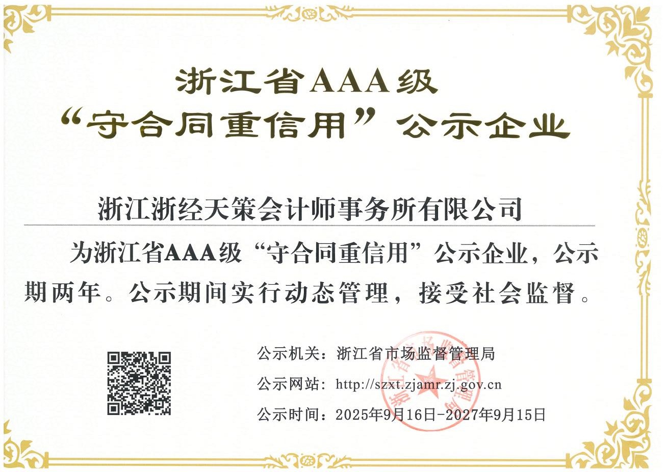 近日,浙江省市场监督管理局浙江省 AAA 级 “守合同重信用” 企业公示名单揭晓,浙经天策机构旗下四家核心成员企业凭借完善的合同管理体系、卓越的履约能力与深厚的诚信积淀,均实现 AAA 级荣誉的连续蝉联。