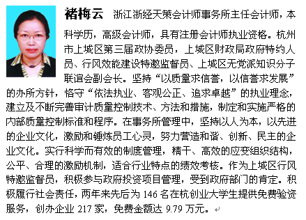 我所褚梅云所长榜上有名(详见2011年5月5日浙江日报18·23专版)。全所员工要以褚梅云所长为榜样,认真学习热爱注册会计师事业,勤勉尽责,遵纪守法,恪守“独立、客观、公正”的优良作风。努力为注册会计师事业健康发展,为全省的经济建设做出自己的贡献。
