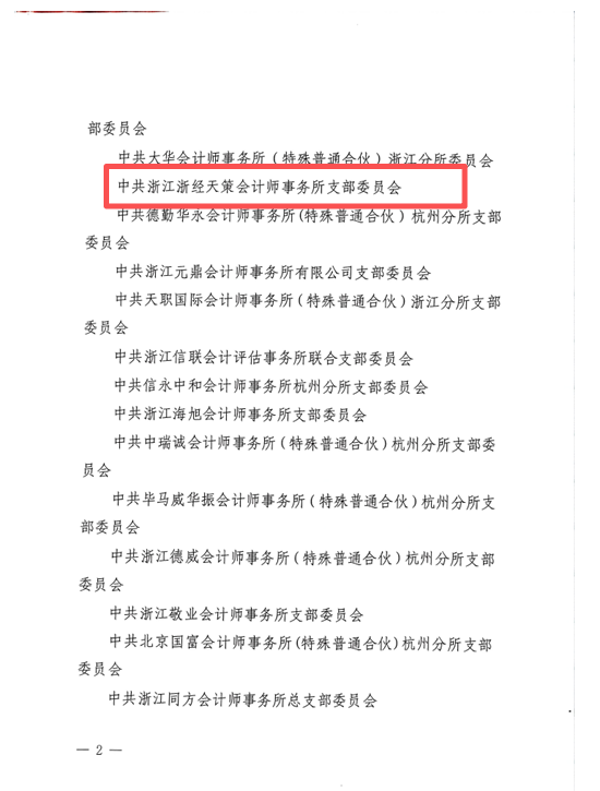 近日,杭州市注册会计师资产评估行业联合党委正式发布《杭会评党〔2026〕2 号 关于 2025 年度杭州市注册会计师资产评估行业星级党组织评定结果的通报》(2026 年 4 月 9 日发文)。中共浙江浙经天策会计师事务所党支部凭借扎实的党建工作、突出的业务融合成效和良好的行业口碑,成功获评2025 年度杭州市注册会计师资产评估行业五星级党组织,已经连续多年荣获此项荣誉。